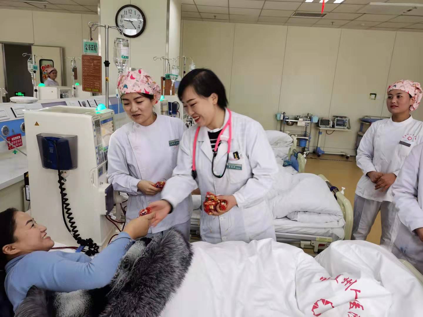 肾病科现有近260名维持性血液透析患者,50名腹膜透析患者,需要透析维持余生,300余名尿毒症患者组成庞大的医疗资源内需团,随时发出各种医疗需求,长期与医生、护士推“心”置“腹”、准时“约会”、电话“情”未了,胜似朋友、仿佛家人。在透析机紧张时期,曾创造连续四班、24h运转的记录,导致机器频繁故障,人何以堪...肾病科、血液透析室医护人员,甚至其家属都早已习惯了没有节假日、随时急诊加班的工作特点,“心里的花,想要带你回家,在那除夕之夜,但愿她没有电话...”,深夜的电话铃声就像平淡生活里的刺,没了它平淡也将归于平凡。这是血透室的大年三十,也是广大医生、护士的除夕。传说古人在新年的前一天用击鼓驱逐防疫疠之鬼,正是己亥之末,武汉疫疠来袭...“过年何须桑梓地,医院无处不除夕”,致敬所有的医护人员!