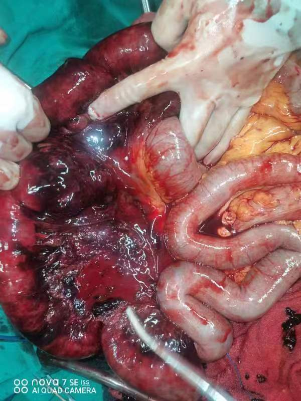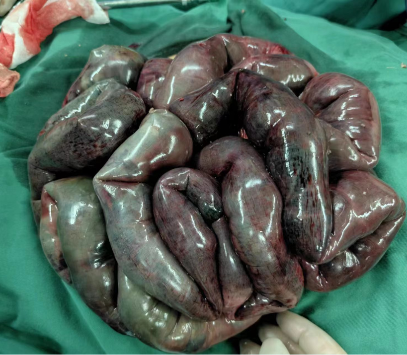 病例二:31岁的女性迟某主因“腹痛、腹胀伴肛门停止排期排便2天入院”,入院时患者表现为剧烈腹痛,伴恶心呕吐,呕吐物为胃内容物。查体发现皮肤湿冷,腹部膨隆,全腹腹膜炎,肠鸣音消失,腹腔穿刺穿出淡血性液体。肛肠科全胜勇大夫给患者进行了腹部CT检查,结果考虑:肠梗阻、小肠坏死可能性大,科主任蒲成林立即组织团队进行手术探查,结果发现患者小肠闭袢性梗阻,4米左右小肠坏死。手术团队以最快的速度松解束带,切除坏死肠管,并行小肠吻合。手术接近尾声时,患者心跳骤停,手术团队与麻醉团队经过快速有效的抢救,患者恢复心跳。手术结束,患者转入ICU,经过长达一个多月的监护治疗,现已好转出院。