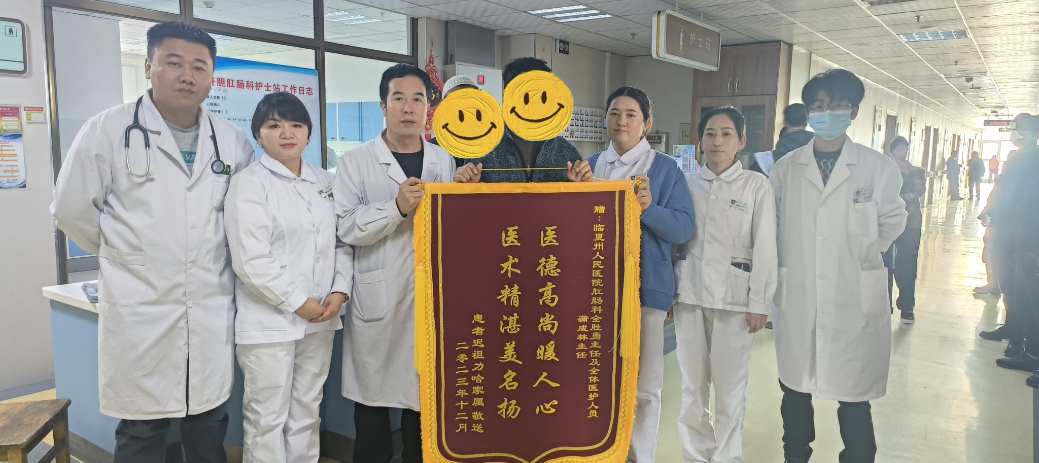 病例一:24岁的年轻男性徐某因“突发意识不清3小时”入院,入院时因患者血糖值太高检测不出而入住ICU。经过积极调整血糖、抗休克等治疗,患者意识渐清。但之后剧烈腹痛,伴恶心呕吐,呕吐物为食物残渣。主管医生当即对患者进行了腹部CT检查,结果发现肠梗阻、大量腹腔积液。请肛肠科医生会诊后多考虑肠坏死、感染性休克、糖尿病酮症酸中毒,汇报科主任蒲成林医师后,立即组织手术探查。术中发现小肠系膜广泛血栓形成,并有对应肠袢坏死,约3.5米,立即行坏死肠段切除,并行小肠吻合。术后患者转入ICU进行监护治疗,经过ICU的严密治疗,患者病情逐渐好转。然而,不幸的是患者于1周左右又发生肠瘘,生命再度面临巨大威胁。肛肠科组织ICU、内分泌科等有关学科开展多学科讨论,大家一致决定先行保守治疗,经过禁食水、强效抗感染、通畅引流、营养支持等治疗,患者病情逐渐好转。术后2个月复查,患者病情痊愈并已恢复正常活动,小伙子怀着感激之情分别为ICU和肛肠科医护团队送上两面锦旗。
