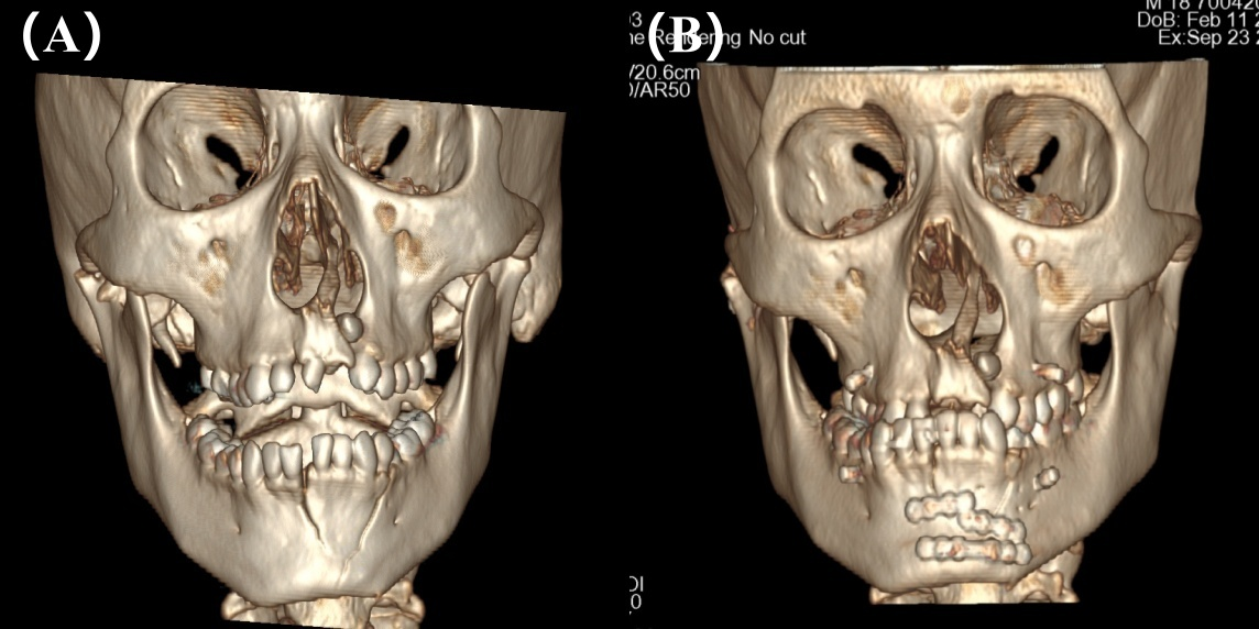 图1:颌面部CT三维重建冠状位影像(A)术前;(B)术后