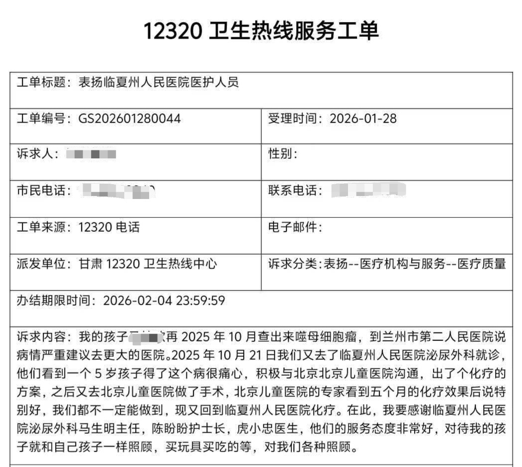 1月28日,甘肃12320卫生服务热线发来一封患者家属对我院泌尿外科的感谢信,信中,患儿家属用质朴的语言,讲述了我院泌尿外科医护团队在救治其5岁孩子过程中的仁心仁术与暖心关怀,字里行间充满了对马生明主任、陈盼盼护士长、虎小忠医生的感激与信任。